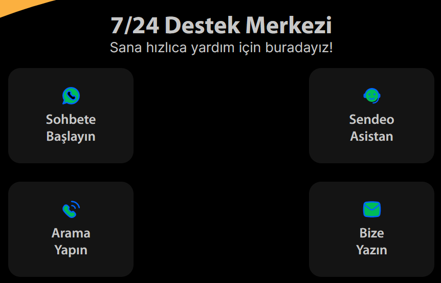 - Canlı destek için Sendeo web sitesi 7/24 destek linkine tıklayarak telefon ile arama, whatsapp yazşma, e-mail gönderme ve telefon ile aranma gibi tercihinize göre iletişim kurabilirsiniz.